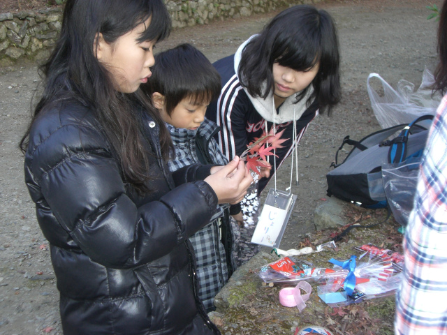 今月は登山しながら、誰かに送るためのプレゼント作りをするという活動を行いました。材料は山に落ちている自然のものを使用しました。登山も作成もどちらかというと個人作業にあたり、グループワークというのが難しいジャンルです。しかし、今まで沢山の活動を共にしてきた参加者の中に身に付いた仲間意識があるのか、誰かが遅れ気味なら待ったり声をかけたりしていました。こちらから言うこともなく、自然にそういった行動が取れるみんなが本当にステキでした。プレゼントも適当ではなく、相手を想い必死に作っている姿も見る事ができました。手紙を添えて受け取れる相手が羨ましいです。相手を思いやる気持ちをみんなにきちんと芽生えていることが確認できた素晴らしい活動でした。
