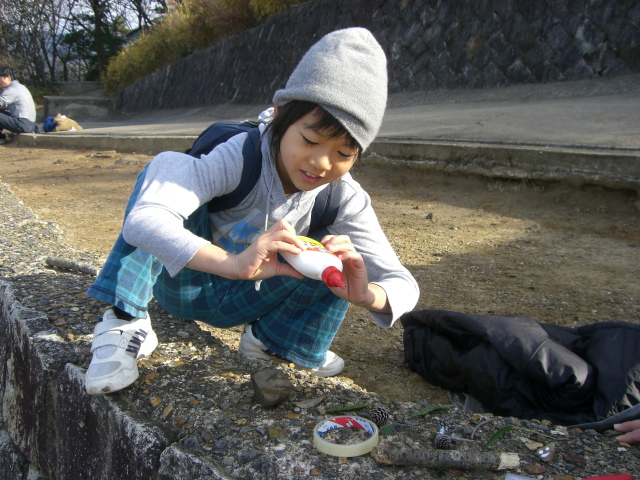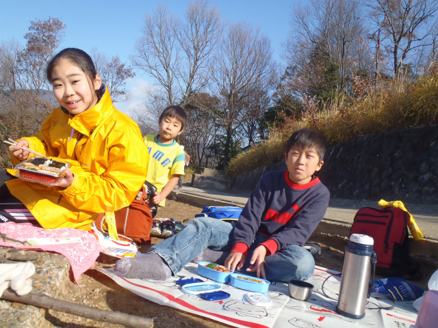 作るのに夢中になっていると、あっという間にお昼になっちゃった…さぁ、お弁当をひろげて昼食にしよう。じっといていると寒くなるから、暖かい格好をね。